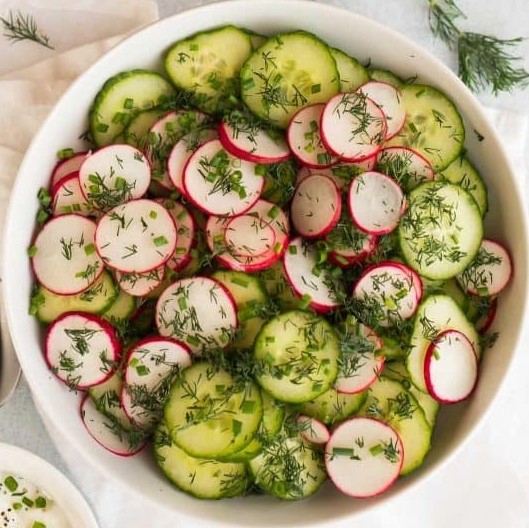 Cucumber and Radish are good paired, together with Dill and Mint brings this refreshing salad.